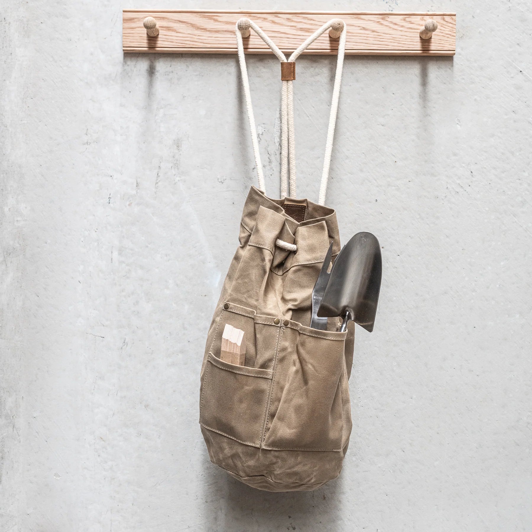 Made from 16oz waxed canvas with an accordion pocket for your water bottle, short and long pocket for other belongings or tools. Thick rope with leather fixings gives a flexibility of use and change of handles with ease.